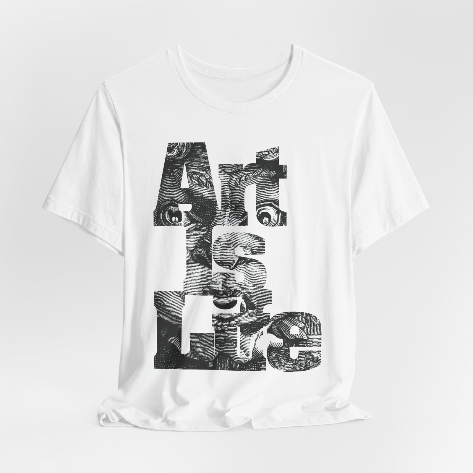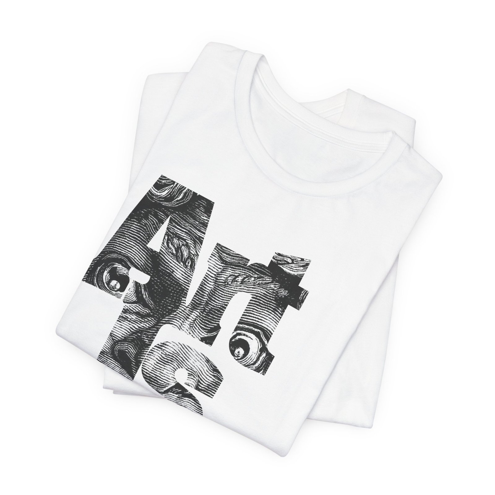 This lightweight crew-neck tee blends everyday comfort with an artful edge. The bold black-and-white typographic design reads as stacked letters filled with textured, collage-like imagery — a quiet statement for people who live around galleries, studios, and city streets. The breathable Airlume combed cotton feels soft against skin and layers easily under a jacket or over a long sleeve. Clean lines, a ribbed collar, and side seams keep the silhouette neat through wear while the tear-away label prevents irritation. Wear it to artist talks, gallery openings, or long studio days when you want clothing that reads like your work: considered, tactile, and a little bit raw.